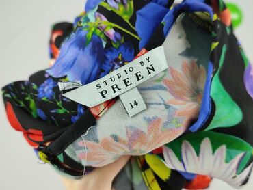 Długi rękawDamska bluzka marki Studio by Preen charakteryzująca się wyrazistym kwiatowym wzorem na czarnym tle. Bluzka ma okrągły dekolt i długie rękawy, które rozszerzają się ku dołowi, tworząc efekt dzwonu. Dół bluzki jest wykończony falbanką, dodającą jej lekkości. Żywe kolory kwiatów, takie jak czerwony, niebieski, żółty i biały, sprawiają, że bluzka jest idealna do noszenia na co dzień, a także na specjalne okazje, dodając stylizacji świeżości i oryginalności.