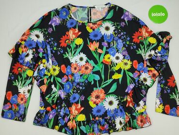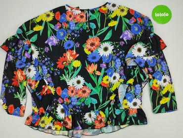 Bluzka damska w czarno‑biały kwiatowy wzór - Krój: lekko taliowana z falbaną/“peplum” u dołu, podkreśla talię - Rękawy: długie, zakończone gumką tworzącą subtelne marszczenie - Dekolt: okrągły - Z...