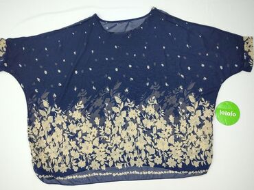 Bluzka damska w kolorze granatowym, rozmiar XL. - Krój: luźny, z okrągłym dekoltem; subtelne zakładki z przodu. - Rękawy: krótkie, wykonane z ażurowej koronki o kwiatowym wzorze. - Materiał: lekki...