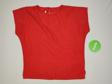 Czerwona bluzka damska z krótkim rękawem - Fason: luźny, z dekoltem w kształcie litery V - Zapięcie: krótna listwa z trzema guzikami z przodu - Rękawy: krótkie, z patką i guzikiem do podpięcia - K...