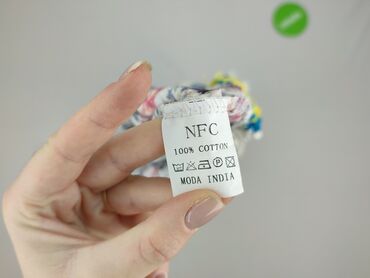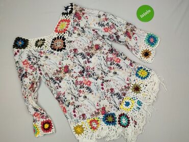 Kolorystyka: baza biała z motywami kwiatów w odcieniach różu, fioletu, żółci i zieleni; szydełkowe elementy wielobarwne (m.in. krem, czarny, granat, zieleń, żółty, turkus, czerwony). Model z szerokim dekoltem, długość zakrywająca biodra, frędzle przy rękawach i u dołu. Marka: NFC. Materiał: 100% cotton. Herkunft: Moda India.