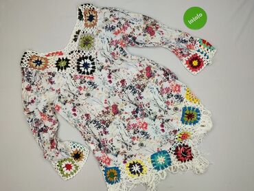 Biała, lekka tunika boho z szydełkowymi wstawkami - Materiał: cienka, przewiewna tkanina (gaza/voile) w kolorze białym - Dekolt i mankiety ozdobione ręcznie robionymi szydełkowymi kwadratami „gran...Stan: