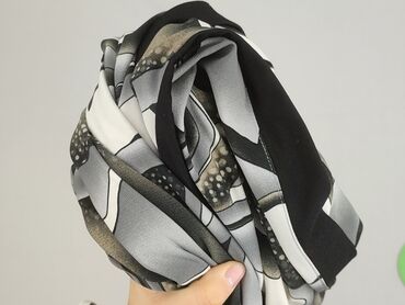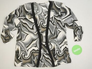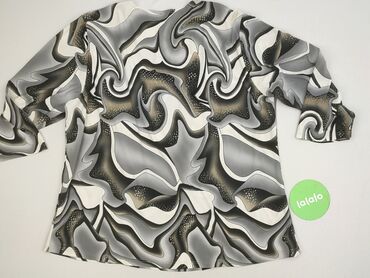 Długi rękawBluzka/tunika damska z długim rękawem, z lejącej, gładkiej w dotyku tkaniny. Efektowny, abstrakcyjny wzór w odcieniach szarości, czerni, bieli i oliwkowego beżu. Z przodu dwa pionowe czarne pasy optycznie wysmuklające sylwetkę, połączone ozdobną metalową obręczą. Luźniejszy, prosty krój z lekkim marszczeniem przy pasach. Tył gładki w ten sam wzór. Okrągły dekolt, rękawy długości pełnej. Materiał nieprześwitujący, miękki, z lekkim połyskiem i dobrą sprężystością (widoczna elastyczność na zbliżeniu). Idealna do spodni i legginsów, na co dzień i na elegantsze wyjścia. Kolory: szarości/czerń/biel/oliwka. Styl: artystyczny, retro/psychedelic.