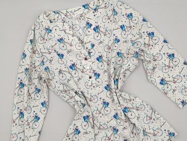 Biała koszula/bluzka damska z krótkim rękawem - Krój: luźny, zapinana na guziki z przodu - Kołnierzyk klasyczny - Dekor: subtelne hafty/żakardowe aplikacje wzdłuż listwy guzikowej po obu stronach ...Stan: