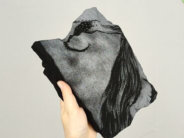 - Przód: duży nadruk w odcieniach szarości – profil kobiety z fantazyjnymi skrzydłami; zdobienia imitujące dżety/kropki przy skrzydłach