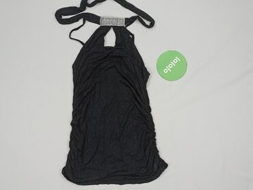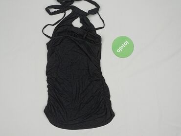 Czarny top damski typu halter - Fason: wiązany na szyi (halter), odkryte ramiona, lekko dopasowany - Dekolt: zaokrąglony z delikatnym wycięciem - Ozdoby: drobne, błyszczące dżety ułożone z przodu ...Stan: