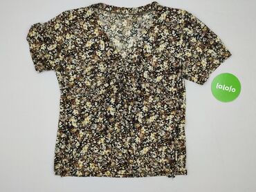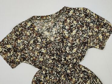 Bluzka damska z krótkim rękawem w kwiaty - Fason: dopasowany, kopertowy przód z dekoltem w serek - Wzór: duże kwiaty w odcieniach fioletu z zielonymi liśćmi na ciemnobrązowym tle - Rękawy: krótkie...