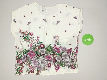 Bluzka damska z krótkim rękawem, w kwiatowy wzór. - Krój: zapinana na guziki z przodu, kołnierzyk, lekko taliowana. - Rękawy: krótkie, luźniejsze. - Wzór/kolor: malarskie kwiaty i liście w odcieni...Stan: