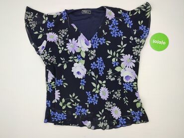 Bluzka damska w kwiatowy wzór - Krój taliowany, podkreślający sylwetkę - Dekolt okrągły - Krótkie, lekko bufiaste rękawy - Długość do bioder - Tkanina lekka, miękka w dotyku - Wzór: gęsty, fioleto...