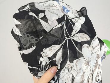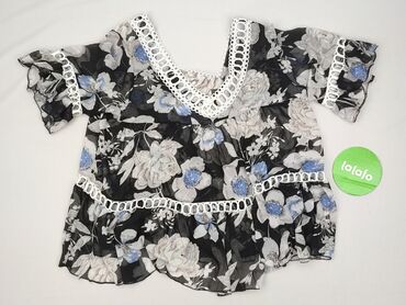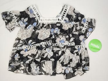 Bluzka damska YES NO, rozmiar M - Krój: luźna bluzka z krótkim rękawem, dekolt w serek, delikatne falbanki przy kołnierzu i na dole - Wzór: czarny materiał w drobne białe kropeczki z różanym motyw...