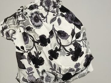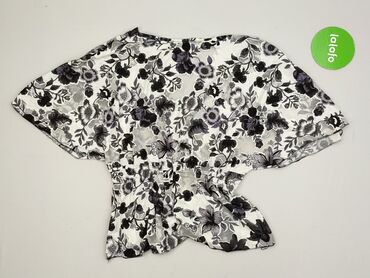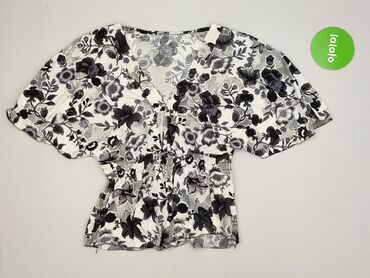 Czarna koszula/bluzka damska z krótkim rękawem i drobnym, białym kwiatowym printem. - Fason: luźny, z delikatnym marszczeniem i dekoltem w serek zapinanym na guziki (z przodu listwa z guzikami). ...