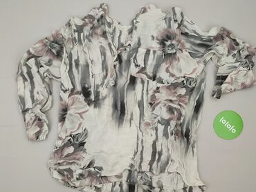 Bluzka damska z lekkiej, półprzezroczystej tkaniny w kolorze białym z kwiatowym nadrukiem w odcieniach różu, zieleni i czerni na rękawach oraz dolnym wykończeniu. - Krój luźny, swobodny - Dekolt ...