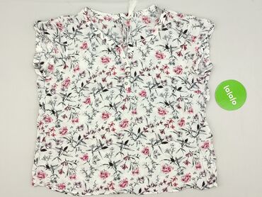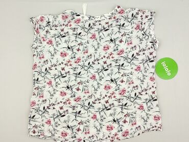 Bluzka damska w kwiaty - Krój: luźny, z zaokrąglonym dołem; bez zapięcia, wkładana przez głowę - Rękawy: krótkie, szerokie, z delikatną falbaną/przeszyciami dającymi efekt bufki - Dekolt: okrągły ...