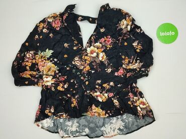 Damska bluzka w kwiaty - Krój: kopertowy przód z falbaną, elastyczna gumka w pasie podkreślająca talię - Rękawy: długie, zakończone gumką i falbanką - Dekolt: V (kopertowy), z delikatną falbaną pr...
