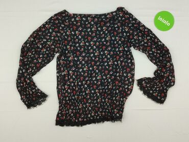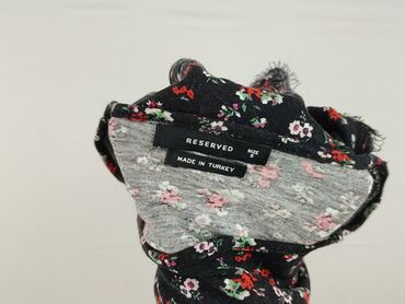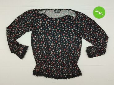 Długi rękawBluzka damska Reserved w rozmiarze S, o czarnym tle z drobnym kwiatowym wzorem w odcieniach czerwieni, bieli i różu. Bluzka ma długie rękawy i ozdobne marszczenia w talii oraz przy mankietach. Dekolt jest szeroki, zaokrąglony. Idealna do casualowych stylizacji, zarówno na co dzień, jak i na specjalne okazje. Zapewnia wygodę noszenia.