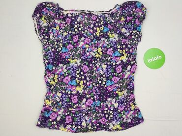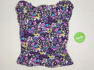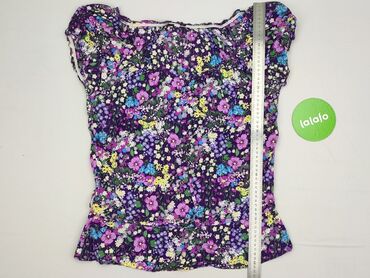 Bluzka damska z krótkim rękawem, z elastycznego, drobno plisowanego materiału. Wzór: wielokolorowy nadruk inspirowany łąką/kwiatami – odcienie zieleni, czerni, szarości, bieli i pomarańczu. Dekolt ...