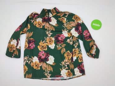 Bluzka damska z bufiastymi rękawami i kwiatowym, geometrycznym printem. - Kolorystyka: ciemna zieleń z akcentami musztardowego, kremowego, czarnego i jasnoróżowych kwiatów. - Krój: luźna, prosta l...