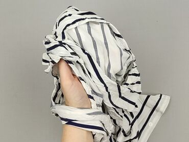 Bluzka damska HOUSE, rozmiar M - Krój: luźny T-shirt z okrągłym dekoltem - Rękawy: krótkie, z dekoracyjnymi wiązaniami na ramionach - Wzór: białe tło w niebieskie pionowe paski, nadruk ptaków na c...