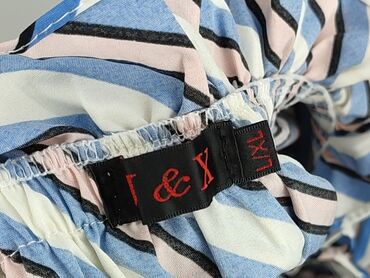 Bluzka damska w czerwono-białe pasy - Fason: luźny, prosty krój z krótkim rękawem - Dekolt: zaokrąglony z ozdobną patką zapinaną na trzy guziki przy lewej stronie - Wzór: poziome pasy; górna część...