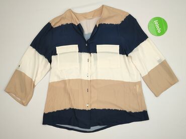 Bluzka damska z kołnierzykiem, zapinana na guziki. - Kolor: jasny krem/ecru z delikatnymi, wielobarwnymi paseczkami (róż, zieleń, błękit, beż) oraz subtelnym, połyskującym przeszyciem. - Krój: lek...