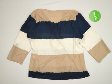 Bluzka damska w paski, z długim rękawem. - Kolor: biel z granatowymi, nieregularnymi, poziomymi pasami (efekt pociągnięcia pędzlem) - Fason: luźniejszy, prosty krój - Dekolt: zaokrąglony z krótkim...Stan: