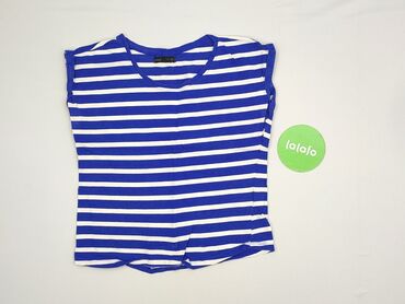 T-shirt damski w paski - Krój: prosty, z krótkim rękawem i okrągłym dekoltem - Wzór: poziome paski biało-niebieskie - Materiał: 100% bawełna (metka z pielęgnacją na zdjęciach) - Tkanina: miękka, d...