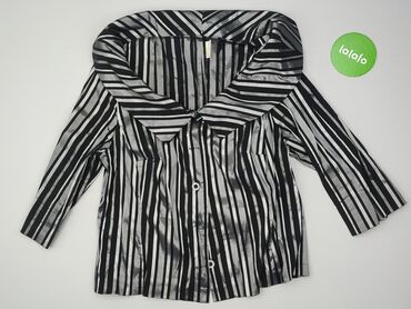 Bluzka damska z kołnierzykiem, w pionowe paski w odcieniach bieli i jasnej szarości. - Fason: zapinana na guziki, z żabotem/ falbanką wzdłuż zapięcia. - Rękawy długie, zakończone mankietem z fa...