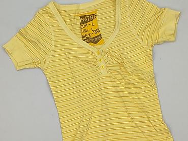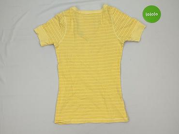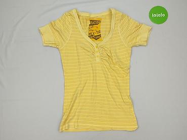 Żółta bluzka damska z krótkim rękawem - Fason: prosty, lekko luźny - Dekolt: okrągły z ozdobnym wycięciem/łezką z tyłu - Rękawy: krótkie - Długość: do bioder - Materiał: miękka, gładka dzianina ba...