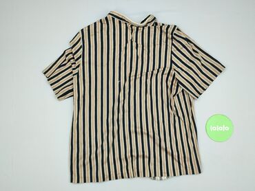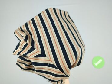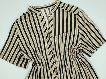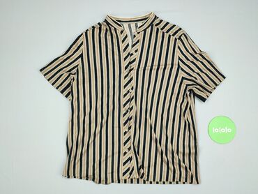 Dzianinowa bluzka damska z krótkim rękawem, w pasy kolorystyczne. - Krój: prosta, lekko dopasowana, okrągły dekolt - Rękaw: krótki - Wzór/kolor: trzy poziome pasy – u góry czarny, pośrodku beż/kar...