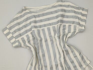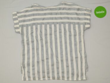 Bluzka damska w paski - Krój: prosta, lekko dopasowana, z krótkimi rękawkami typu cap. - Dekolt: okrągły. - Wzór i kolor: poziome paski w odcieniach zgaszonego różu i bieli; górny karczek oraz lam...