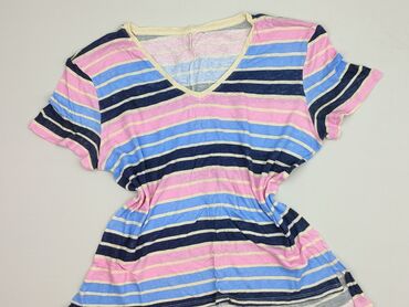 T-shirt damski w kolorowe, poziome paski - Fason: luźny, prosty krój z krótkim rękawem i okrągłym dekoltem - Wzór: wielobarwne pasy w odcieniach różu, żółci, zieleni, błękitu i fioletu; drobna, ni...