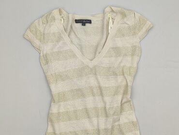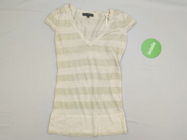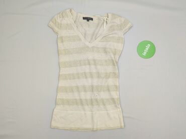 Bluzka damska w paski, rozmiar S. - Marka: Blue Pate (etykieta na zdjęciu) - Kolor: granatowy z białymi pionowymi paskami - Skład materiału: 50% bawełna, 50% poliester (metka) - Krój: lekko rozklo...