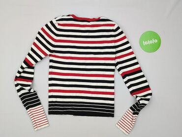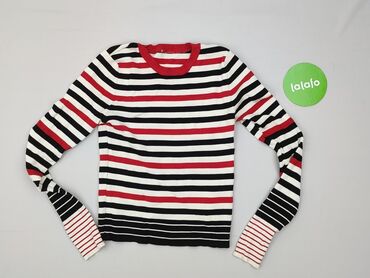 Bluzka damska z długim rękawem, rozmiar S. - Krój: dopasowany, długość do bioder - Dekolt: okrągły, z ozdobną wstawką i kontrastowym, czarnym panelem po prawej stronie - Wzór: kolorowe, poziome pa...