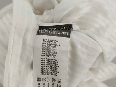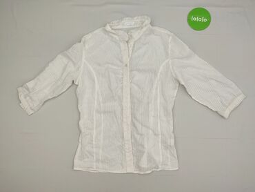 Biała damska koszula/bluzka z krótkim rękawem - Klasyczny krój, zapinana z przodu na cztery guziki - Ozdobny kołnierzyk z ażurową aplikacją - Mała kieszonka na piersi z dekoracyjną wstawką ażurową...