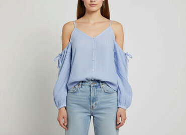 Bluzka damska w niebiesko-białe paski, charakteryzująca się fasonem odkrywającym ramiona i długimi rękawami z mankietami. Dekolt w kształcie litery V, zapięcie na guziki z przodu. Wykonana z wiskoz...