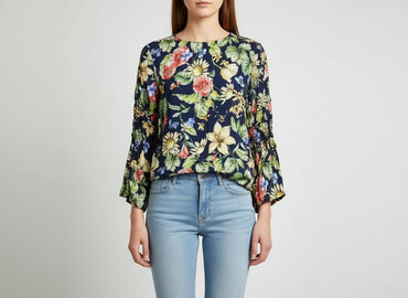 Bluzka damska z długim rękawem, wykonana w 100% z wiskozy. Charakteryzuje się okrągłym dekoltem oraz kwiecistym wzorem na granatowym tle, zawierającym motywy takie jak żółte, czerwone i niebieskie ...