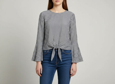 Bluzka damska z długim rękawem, wykonana z bawełny, z dekoltem okrągłym z rozcięciem na plecach zapinanym na guzik. Charakteryzuje się wzorem w biało-granatowe paski oraz wiązaniem z przodu, co nad...