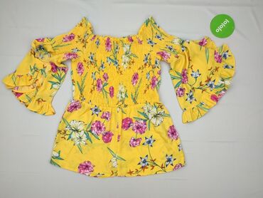 Bluzka damska S/M – żółta w kwiaty, odkryte ramiona - Krój: hiszpanka z falbaną przy dekolcie, odkryte ramiona i cienkie ramiączka; długie rękawy zakończone lekką falbanką. - Wzór/kolor: intensywn...
