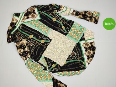 Długi rękawBluzka damska we wzory, z długimi rękawami. Charakteryzuje się bogatym, patchworkowym wzorem łączącym motywy łańcuchów, barokowych ornamentów i geometrycznych kształtów w odcieniach czerni, złota, zieleni, beżu i bieli. Kołnierzyk dodaje jej elegancji, a luźny fason zapewnia komfort noszenia. Idealna do wielu stylizacji, zarówno codziennych, jak i na specjalne okazje, doskonale sprawdzi się w garderobie każdej kobiety ceniącej oryginalny styl. Bluzka jest w bardzo dobrym stanie.