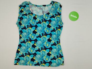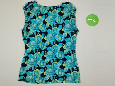 Bluzka damska z krótkim rękawem w tropikalny wzór - Kolor bazowy: intensywny kobalt/niebieski - Wzór: duże kwiaty i liście w odcieniach różu, pomarańczu, zieleni i kremu - Krój: swobodny, lekko za...