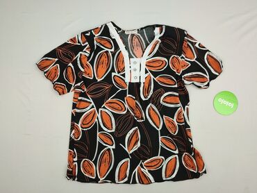 Krótki rękawBluzka damska z dekoltem w serek, ozdobiona białymi patkami z trzema guzikami, w tym dwoma widocznymi przelotkami. Wzór w liście w odcieniach pomarańczowego i białego na czarnym tle nadaje jej wyrazisty charakter. Krótkie rękawy zapewniają komfort noszenia. Idealna do codziennych stylizacji, która doda koloru i oryginalności. Dzięki połączeniu bawełny i spandexu, bluzka jest wygodna i elastyczna, dobrze dopasowuje się do sylwetki.