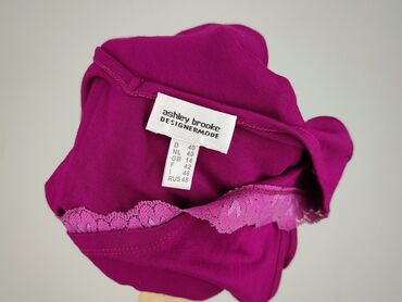 Fioletowa bluzka damska marki Laura Ashley. Charakteryzuje się dekoltem w kształcie litery V z ozdobnym zakładaniem materiału z przodu. Posiada szerokie rękawy i elastyczne marszczenie w talii, któ...
