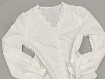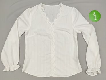 Bluzka damska z długim rękawem, biała, z koronką - Krój: prosty, lekko luźny, okrągły dekolt - Rękawy: długie - Zapięcie: półguziki z tyłu pod szyją - Detale: bogate, ażurowe wstawki koronkowe z p...