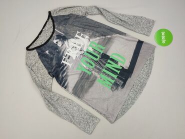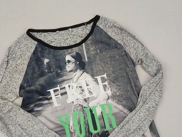 Szara bluzka damska z długim rękawem i nadrukami napisów. - Kolor: jasnoszary z jaśniejszymi wstawkami i dekoracyjnymi przeszyciami. - Krój: luźny, zaokrąglony dekolt, tył gładki, przód z panelam...Stan:
