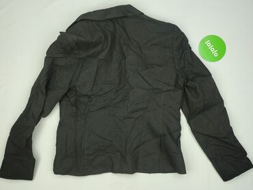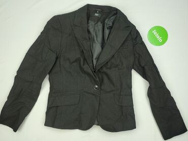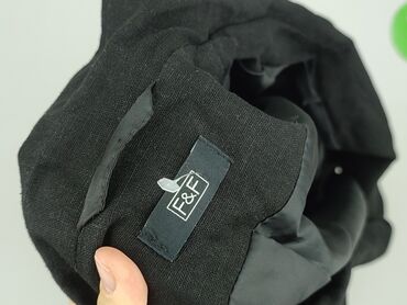 Żakiet damski F&F - Kolor: ciemnoszary w drobny prążek - Krój: klasyczny, taliowany; klapy w szpic (notch lapel) - Zapięcie: 2 guziki z przodu; na mankietach ozdobne guziki - Kieszenie: dwie przed...