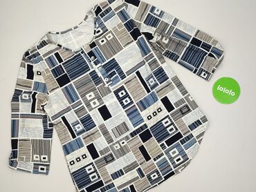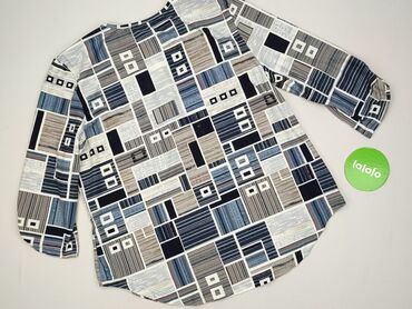Bluzka damska z długim rękawem, rozmiar L. - Wzór: geometryczny, retro – beżowo-szare prostokąty i owalne motywy na białym tle - Fason: luźny, prosty krój - Dekolt: w serek z krótką listwą guzikow...