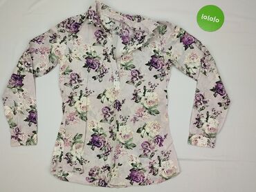 Bluzka damska z krótkim rękawem, ozdobiona wzorem w drobne kwiaty w odcieniach fioletu i błękitu, doskonale sprawdzi się w codziennych stylizacjach. Klasyczny kołnierzyk i zapięcie na guziki na cał...