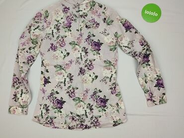 Fioletowa bluzka damska z długim rękawem, ozdobiona drobnym, białym i fioletowym wzorem kwiatowym. Posiada okrągły dekolt z rozcięciem na plecach zapinanym na guzik, a także delikatne marszczenia z...