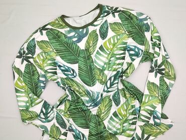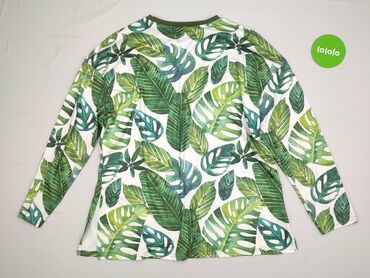 Bluzka damska z tropikalnym nadrukiem - Krój: luźny T-shirt z krótkim rękawem - Dekolt: okrągły - Długość: lekko wydłużony tył (asymetryczny dół) - Wzór: gęsty print roślinny – liście palm, monste...
