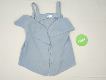 Bez rękawówBluzka damska w kolorze błękitnym z falbanami, które tworzą efektowne wykończenie dekoltu i ramion. Model posiada cienkie ramiączka oraz zapięcie na guziki z przodu, co ułatwia zakładanie. Idealna propozycja na ciepłe dni, dodająca lekkości i dziewczęcego uroku stylizacjom. Może być noszona zarówno na co dzień, jak i na bardziej uroczyste okazje.
